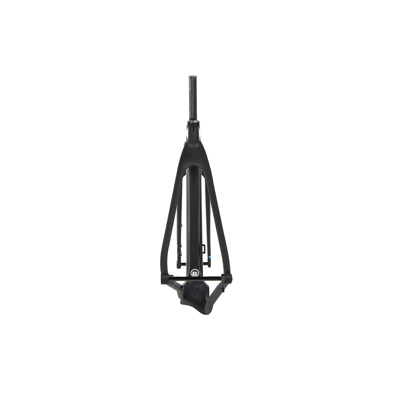 The downtube has been designed for torsional stiffness. High-modulus carbon on the sides, and lower-modulus in the middle. Likewise, the top and downtubes are as widely-spaced as possible to improve torsional strength for the fork. This is why the top of the headset is flush with the top tube. Internally, The U.P. runs a tapered 1 1/8” to 1 1/2” steerer, also for rigidity. The fork, also set up for wide tires, same widths as the rear end, includes an superlight 12mm thru-axle from Carbon-Ti that tightens via a 5mm hex head key.