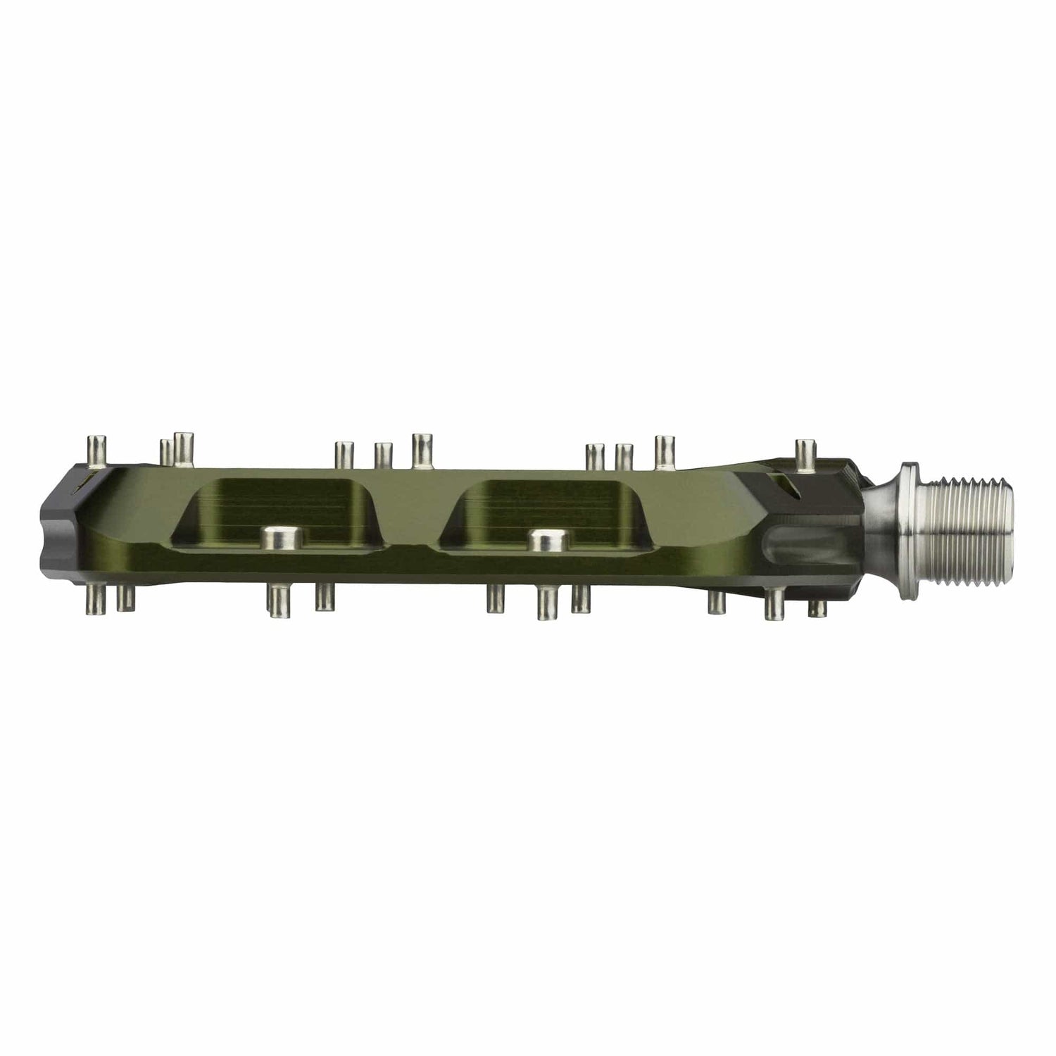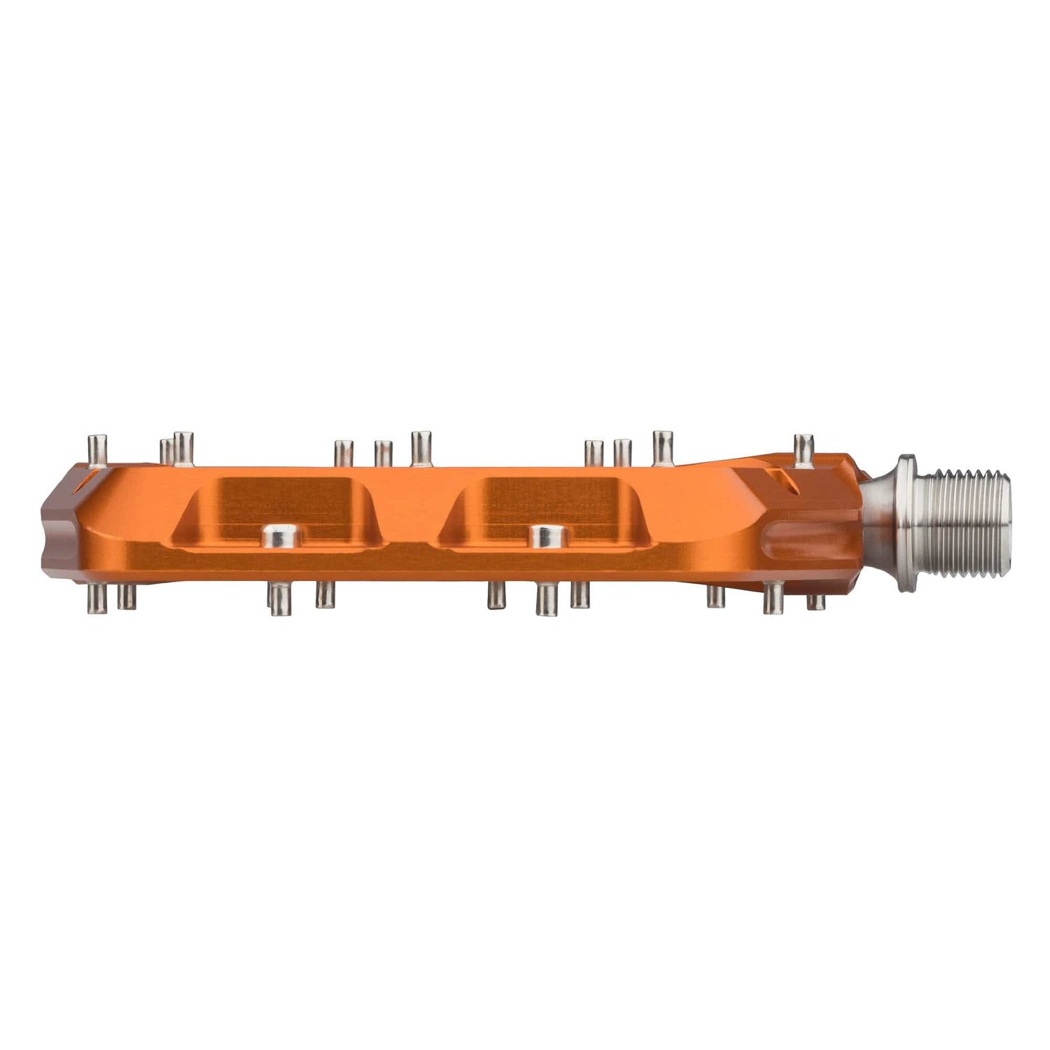 Each side features eleven rear-loading stainless steel pins, delivering consistent, adjustable traction without complicating maintenance. The large, tapered leading edge is purposefully shaped to deflect pedal strikes, reducing hang-ups on rocks and roots while keeping momentum intact. Inside, three fully sealed cartridge bearings and an igus bushing are protected by a custom radial seal, ensuring smooth, low-friction performance in wet, dusty, and demanding conditions.